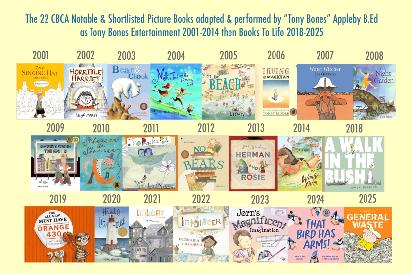 MUSIC & SONGS CREATED WITH TONY APPLEBY FOR CBCA SHORT-LISTED BOOKS FOR TONY BONES ENTERTAINMENT Co-Composer, Sound Arranger.